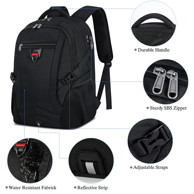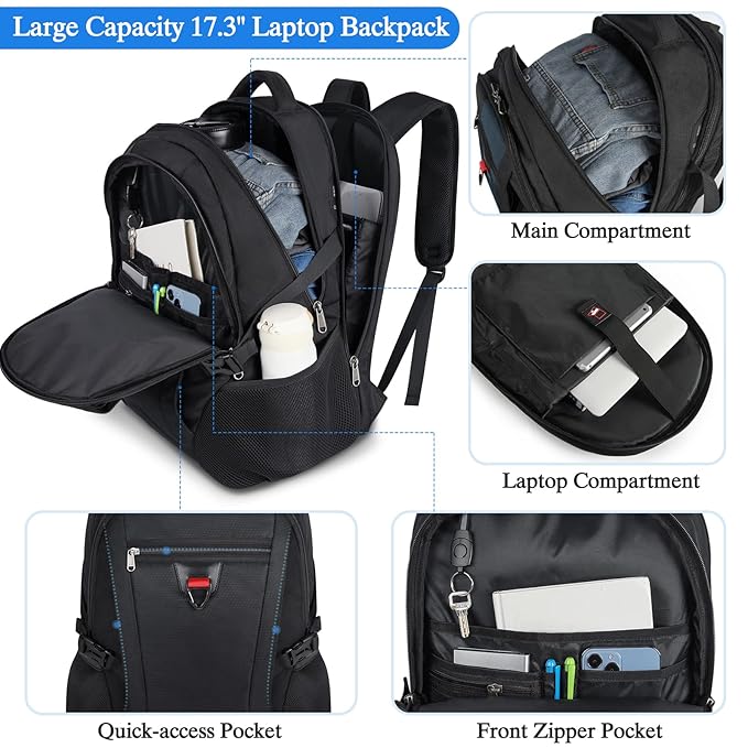- مساحة كبيرة ومنظمة: 13.8 × 8.3 × 18.9 بوصة (الطول × العرض × الارتفاع)؛ الوزن: 1.12 كجم؛ تحتوي حقيبة الظهر للكمبيوتر المحمول هذه على حجرة منفصلة للكمبيوتر المحمول مقاس 17 بوصة والفأرة والشاحن؛ يمكن لحجرة رئيسية واحدة حمل الكتب والمجلدات والملابس وصندوق الغداء وغيرها من الضروريات اليومية؛ يمكن تنظيم الحجرة الأمامية بسحاب مع العديد من الجيوب بشكل جيد لأغراضك الصغيرة والوصول السريع.