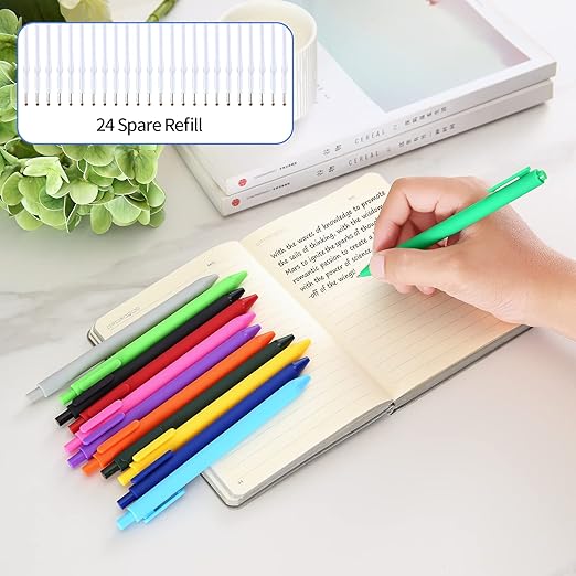 - [قلم جمالي] سوف تتلقى 12 قلم حبر جل قابل للسحب بألوان مختلفة و24 عبوة إعادة تعبئة، بسيطة ولكنها أنيقة في التصميم، ناعمة وجيدة الملمس. قلم جميل، بحجم مثالي، مناسب للاستخدام اليومي والاستبدال. قلم جل