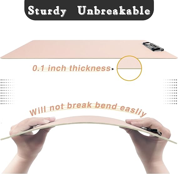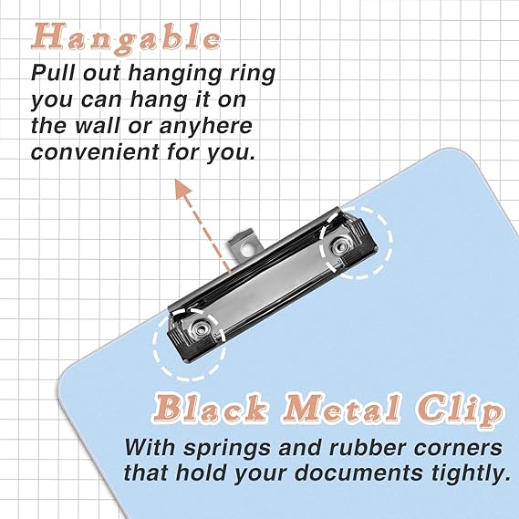 - التصميم: يوجد قطعة معدنية أعلى المشبك المعدني يمكن استخدامها لتعليق مشبك اللوحة. يستخدم جسم اللوحة عملية خاصة لجعله أكثر سمكًا وصلابة، مع نسيج سطح غير لامع لكتابة أكثر راحة. الحواف مدورة للحصول على لمسة نهائية أكثر أمانًا وحميمية. زنبرك مرن للغاية، يمكنه حمل ما يصل إلى 100 ورقة.